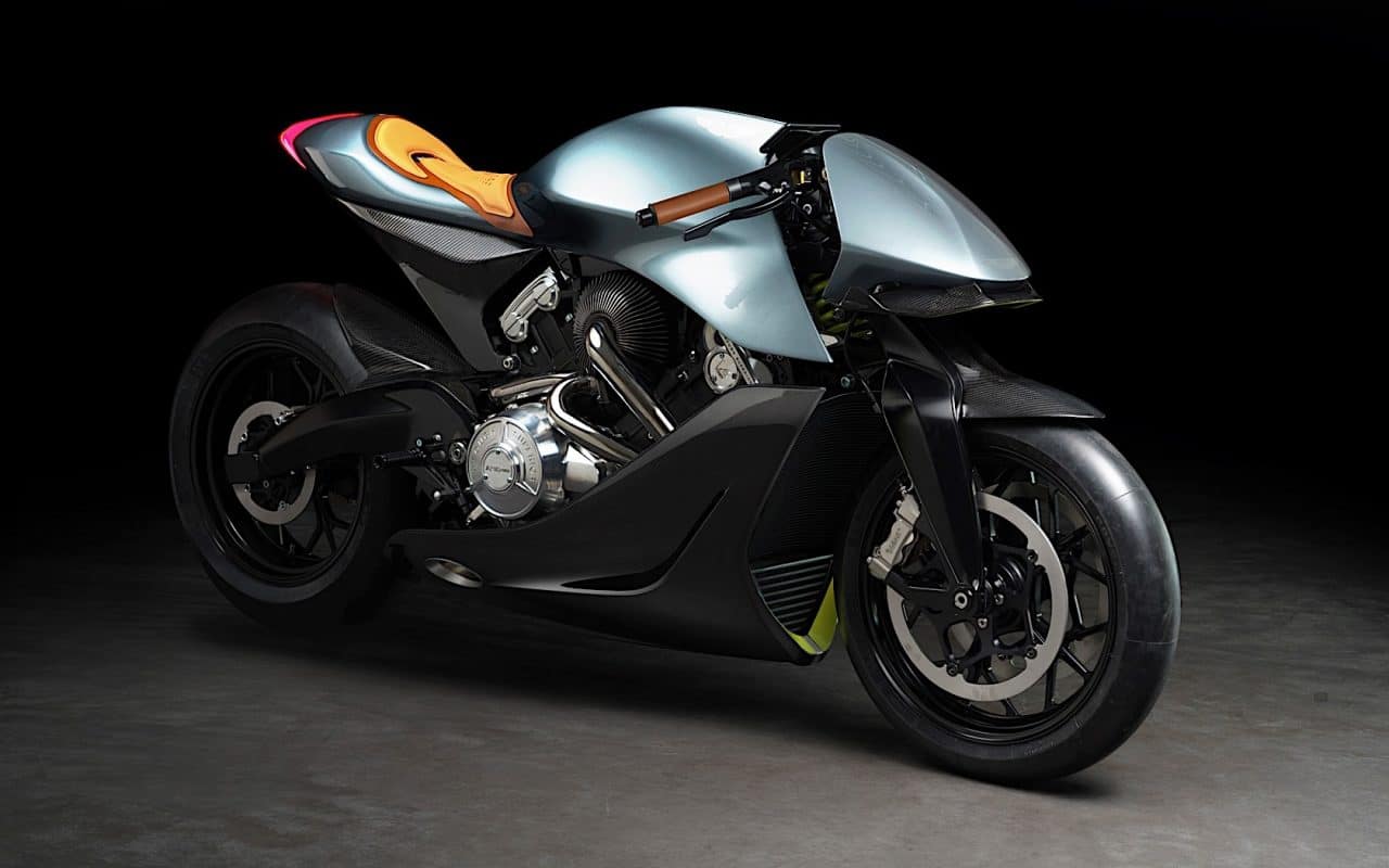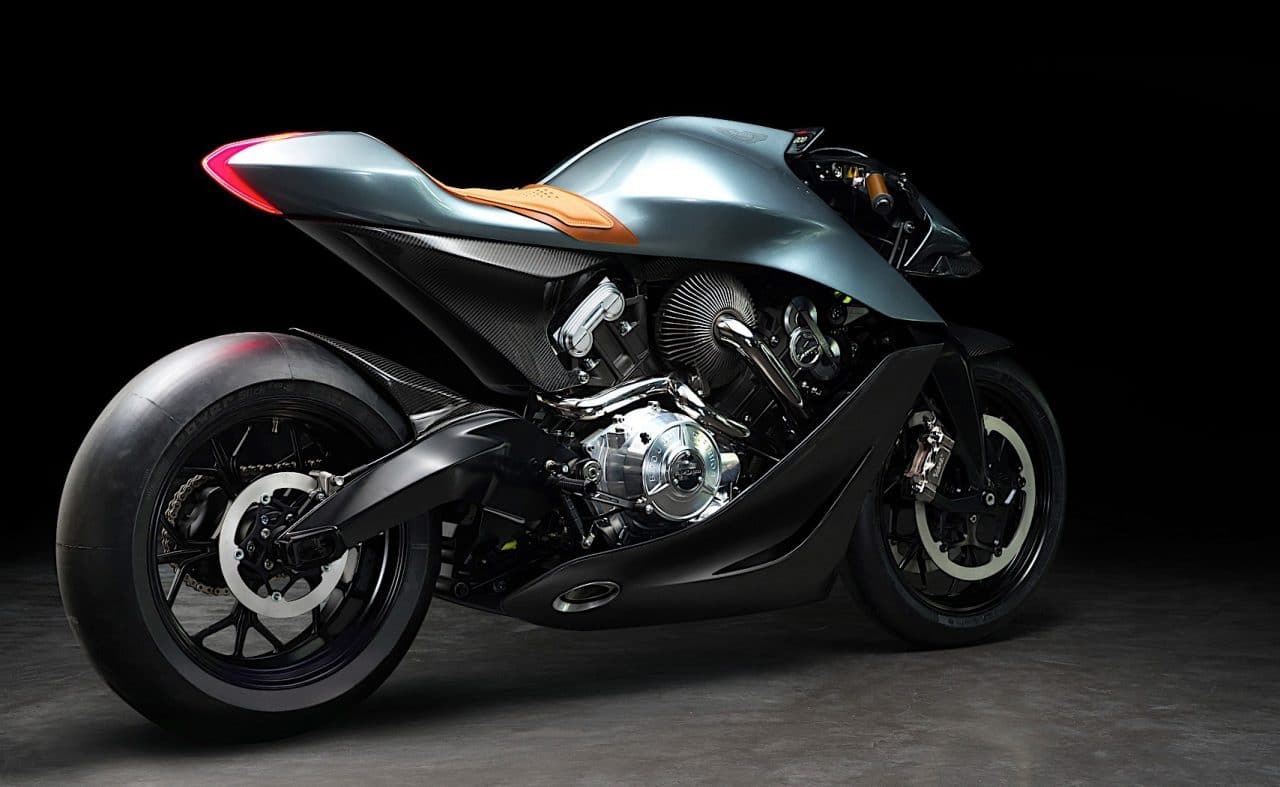Cette dernière est baptisée AMB 001, et incarnerait selon la firme anglaise un pont entre la performance et l’élégance, grâce notamment à une ligne très aérodynamique. Limitée à seulement 100 exemplaires, l’AMB 001 est dotée d’un V-Twin turbo développant 180 ch pour un poids à vide de 180 kg. Ce choix de motorisation promet ainsi un couple énorme sur une large plage d’utilisation. L’ensemble est maintenu par un cadre allégé construit en fibre de carbone, titane aluminium, un peu comme ses cousines à quatre roues… En terme de look, on retrouve les classiques vert « Stirling green » et jaune « Lime Essence » qui rappellent les livrées sportives Aston Martin. Mention spéciale à la présence d’éléments en cuir Oxford Tan (selle, poignées…) pour une touche encore plus « british ».