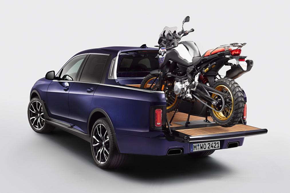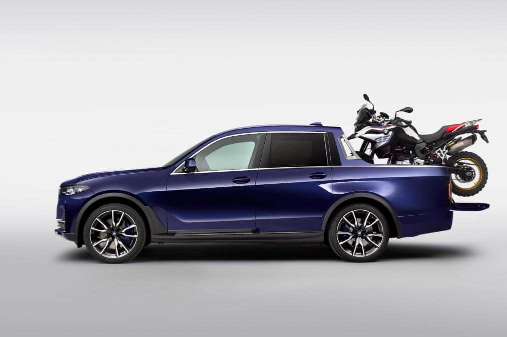 Ce pick-up est capable d’embarquer une 850 GS à l’arrière, même s’il faudra pour cela rouler avec la porte de benne ouverte. Heureusement, des points d’accroche pour maintenir la moto en place ont été prévus dans la benne. Ce pick-up reprend la base du X7 à moteur six cylindres en ligne 3.0 de 340 ch, avec une transmission intégrale et un système de suspension à hauteur réglable.