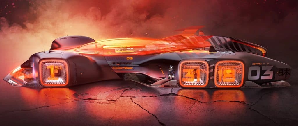 Ensuite, on remarque le design très futuristes des bolides, qui nous font même penser aux prototypes de Robocar actuellement en développement. Ensuite, ces voitures de course semblent posséder 6 roues sur les premières illustrations, puis 6 arches carrés sur d’autres, surement pour protéger les roues ? Et parce que nous sommes en 2088, ces engins ne seront pas pilotés directement depuis le véhicule lui-même, mais à distance. Cela permet ainsi à aux bolides de la CyberRace d’être plus rapides grâce à design encore plus aérodynamique. L’énorme spoiler avant aura d’ailleurs pour mission de refroidir le moteur.