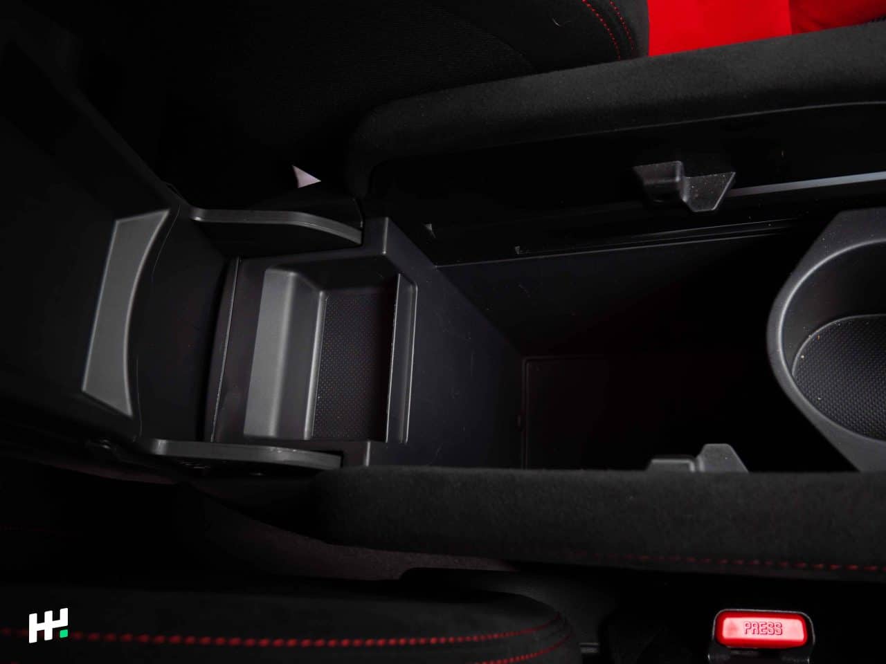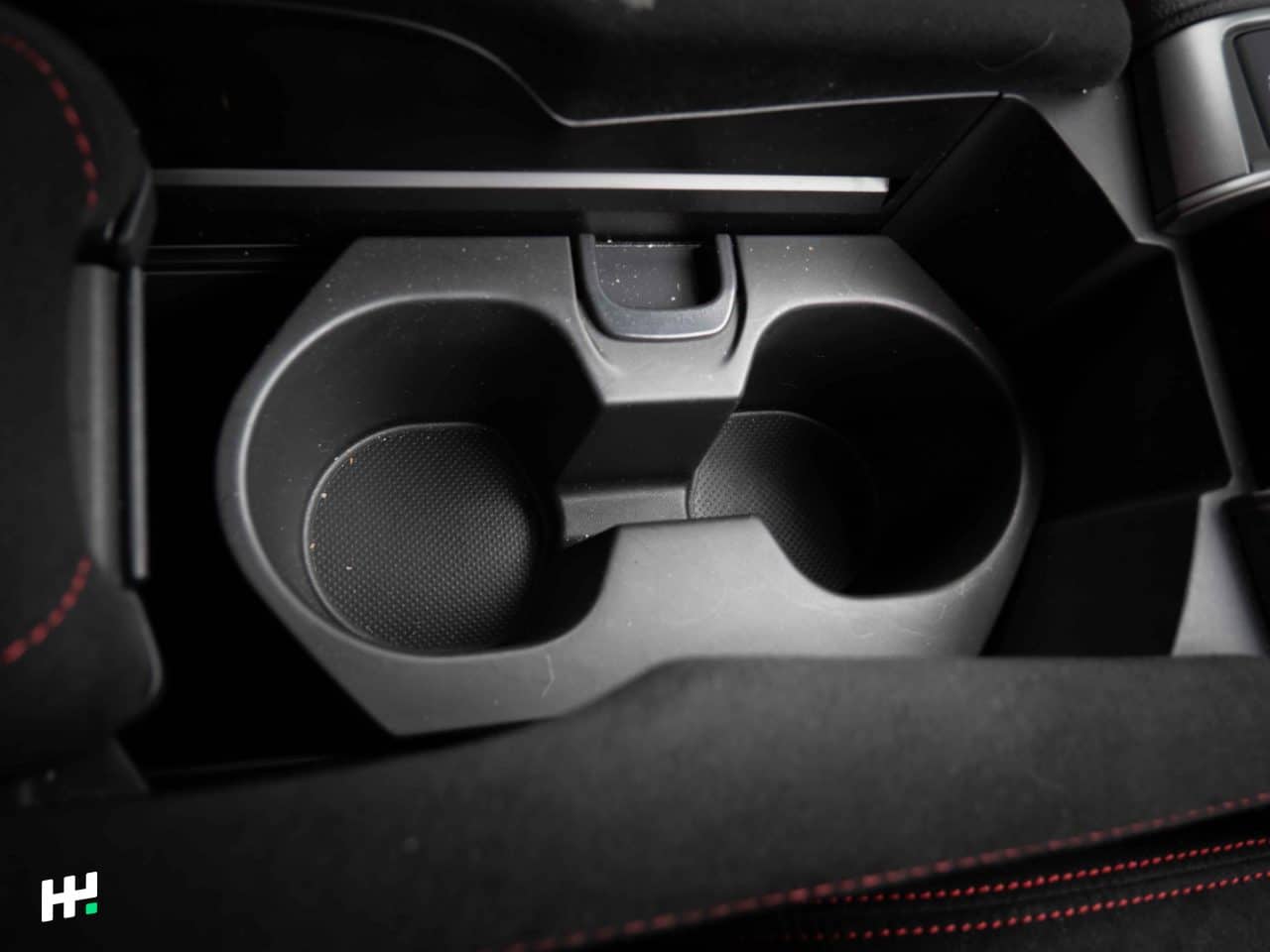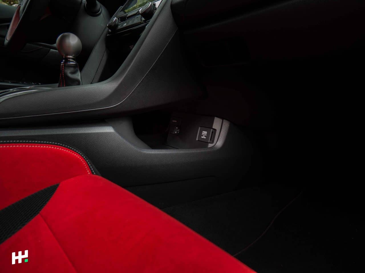 Pas de grande surprise de ce côté là, la Civic Type R offre des rangements aux emplacements habituels : vide-poche, portières (avant et arrière), et boîte à gants plutôt spacieuse. L’accoudoir central cache aussi un rangement supplémentaire avec porte-gobelets. A l’arrière, les rangements dans les portes sont minuscules. Pour conclure, on aurait pu pinailler : la présence d’aérateurs pour les passagers arrière (au niveau de l’arrière de l’accoudoir) aurait été bienvenue. Mais c’est de l’ordre du détail.