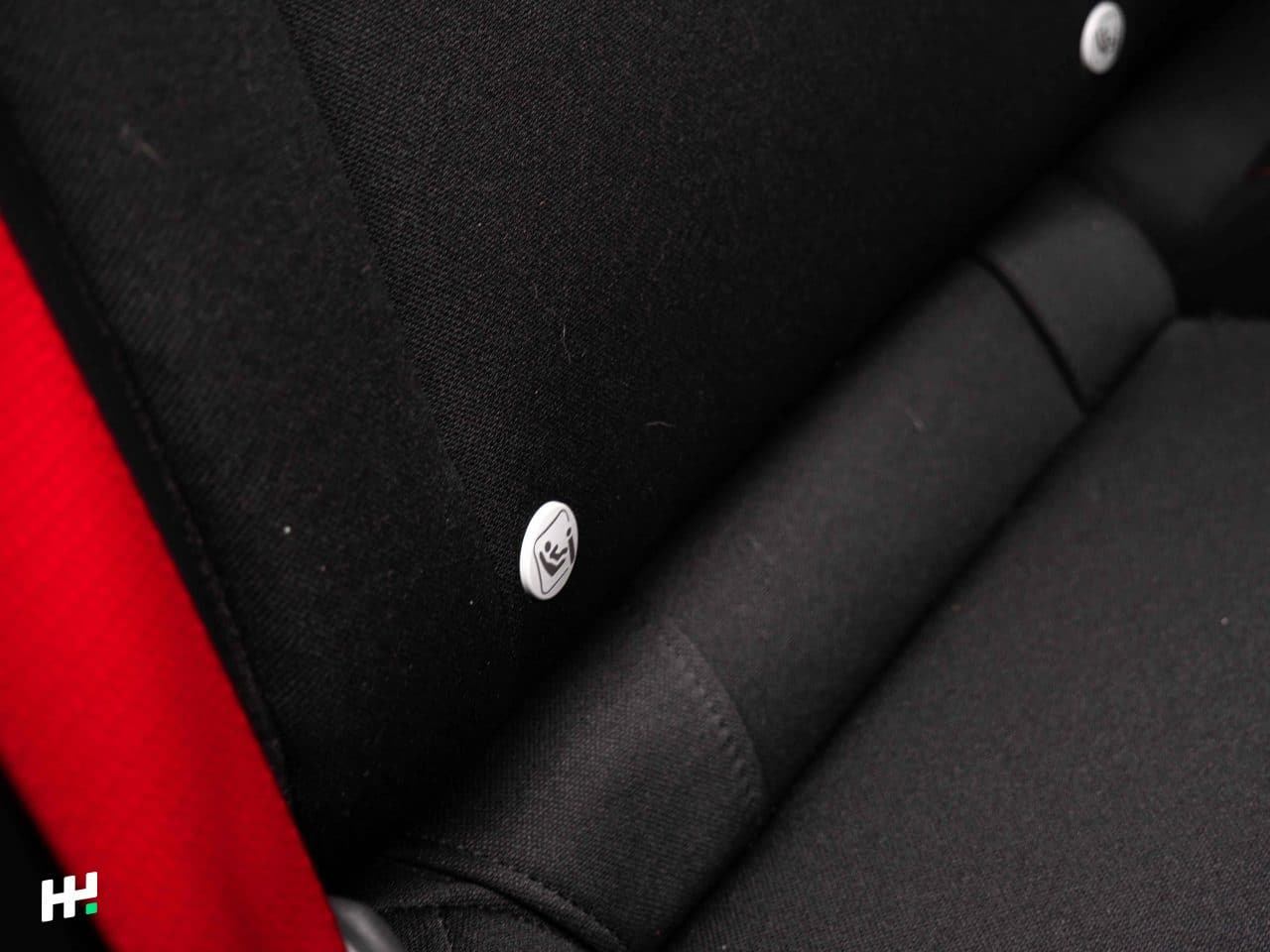La sellerie est à deux visages dans la Civic Type R. Une banquette arrière plutôt classique, en tissu, relativement confortable et accueillante, qui propose de l’espace pour deux adultes avec une garde aux genoux et à la tête plus qu’acceptable. Et puis il y a ces superbes sièges avant baquets en une seule pièce, marqués par la présence de meurtrières qui servent normalement à faire passer des harnais. Mais ici, point de harnais six points, la ceinture (rouge, s’il vous plaît), est tout ce qu’il y a de plus classique.