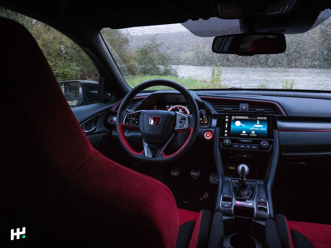 La position de conduite est idéale puisque les amplitudes de réglages sont nombreuses, y compris avec le volant et son déplacement en profondeur. Ces sièges baquets ne sont pas là que pour faire joli puisqu’ils maintiennent admirablement bien en courbe. Bref, tous les gabarits sauront trouver leur place à bord de cette Civic qui se montré étonnamment accueillante pour les passagers arrière.