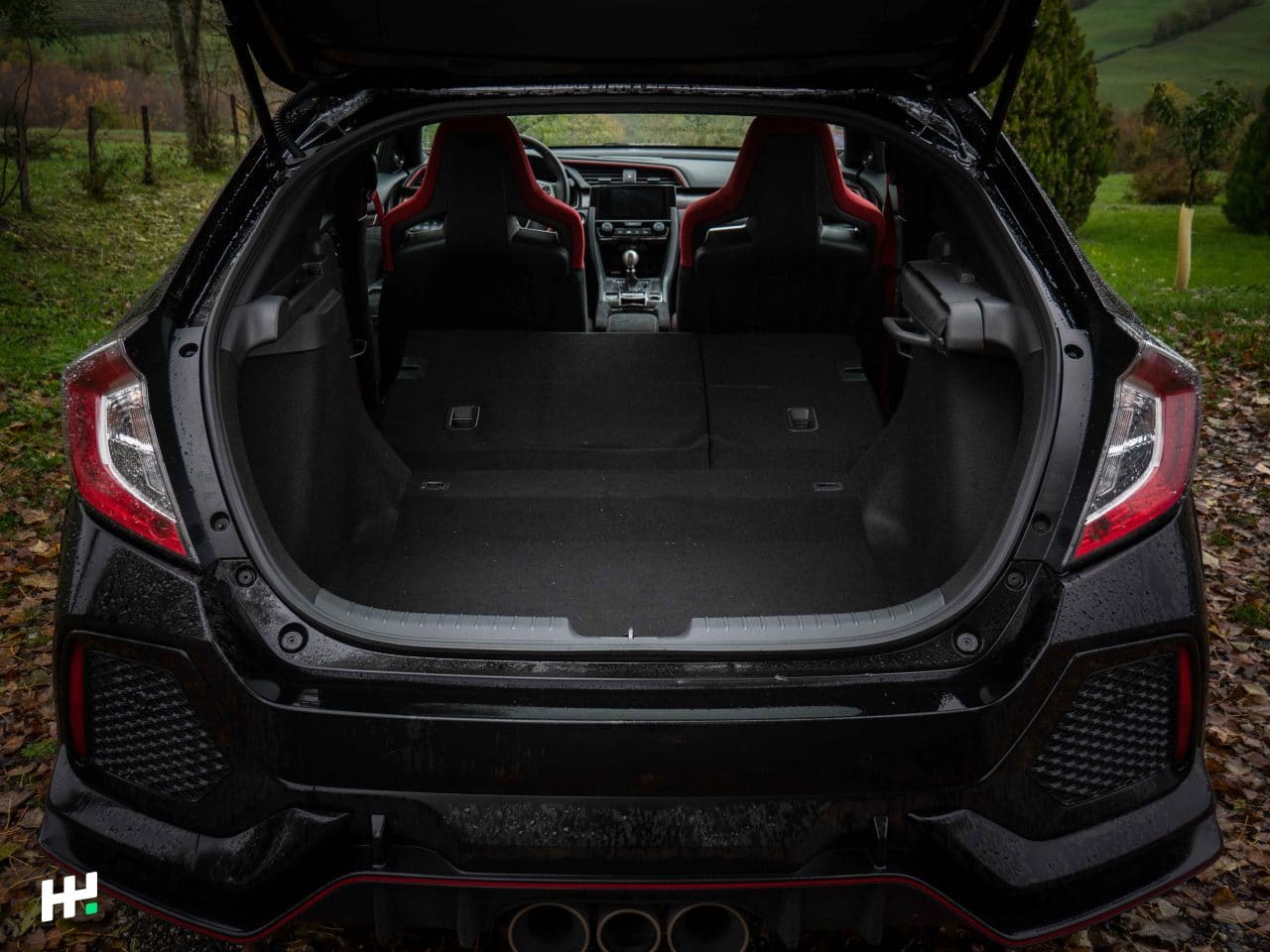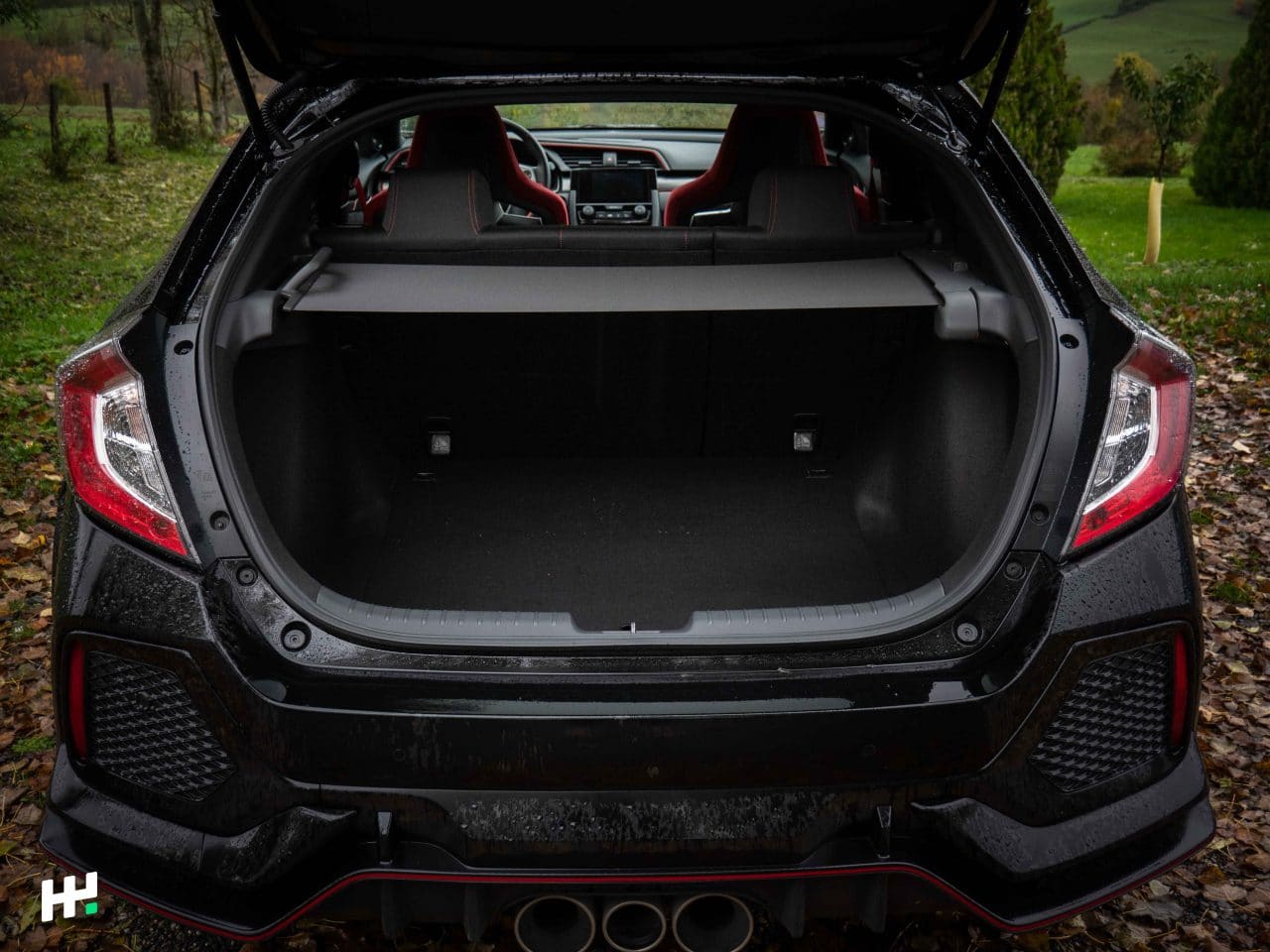 Pour une voiture de 4,55 mètres, la Civic Type R est particulièrement accueillante. Et à l’ouverture du coffre (manuelle, le hayon électrique n’existant pas), on se dit que l’on partirait bien en vacances avec l’auto. Chose que l’on a faite ! Nous pouvons du coup vous faire un retour sur ces 420 litres qui sont généreux, et, surtout, l’ouverture du coffre offre une grande amplitude qui laisse un accès très large et haut au coffre. Le volume de coffre s’explique aussi, en partie, par le fait que le réservoir est situé sous la banquette arrière (pour des question de répartition de poids entre essieux).