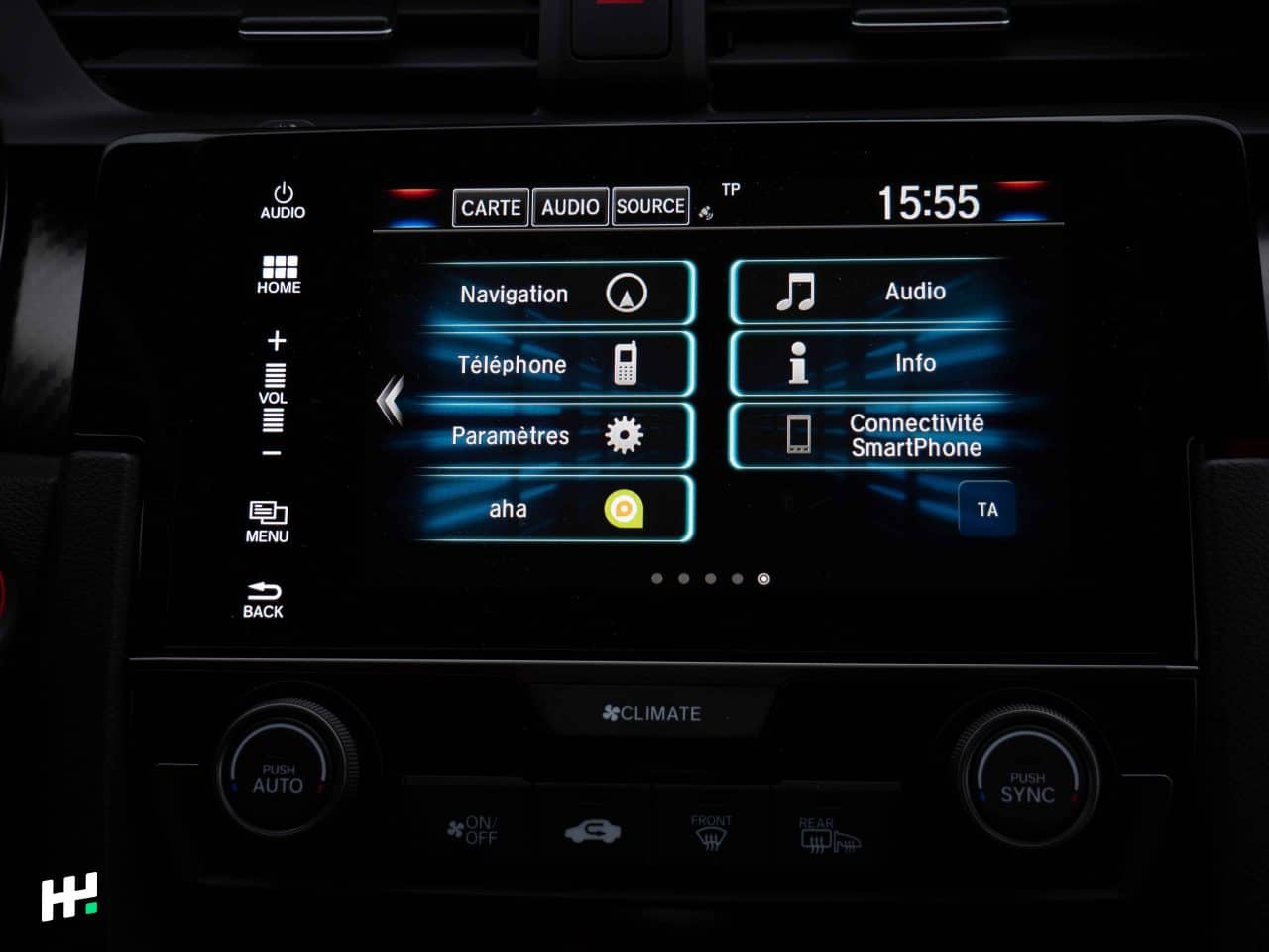 L’écran de 7 pouces est plutôt réactif, mais Honda a clairement du retard en matière d’environnement logiciel. Les menus sont un peu fouillis et les réglages parfois curieux. Le design des applications et des widgets est trop simpliste et fait un peu archaïque. Heureusement, le principal y est, et il est possible de régler le retour de sensibilité du tactile (mettez-le à fond, ça sera mieux) sur cet écran qui aurait pu être un peu plus travaillé. Son emplacement, relativement haut, est en revanche facilement accessible.