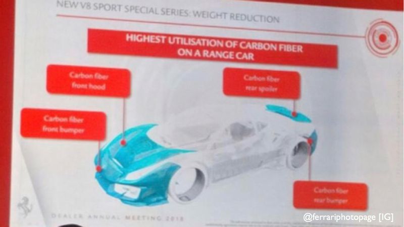 La supercar italienne sera dotée de beaucoup plus de fibre de carbone qu’aucunes autres Ferrari (homologuée route) avant elle. On en retrouvera sur le capot avant, le pare-choc, le spoiler arrière actif ou encore le pare-choc arrière. Presque toute la carrosserie y passe. Toujours grâce à ses documents, on apprend que ces modifications structurelles optimiseraient l’aérodynamisme de plus de 20%.