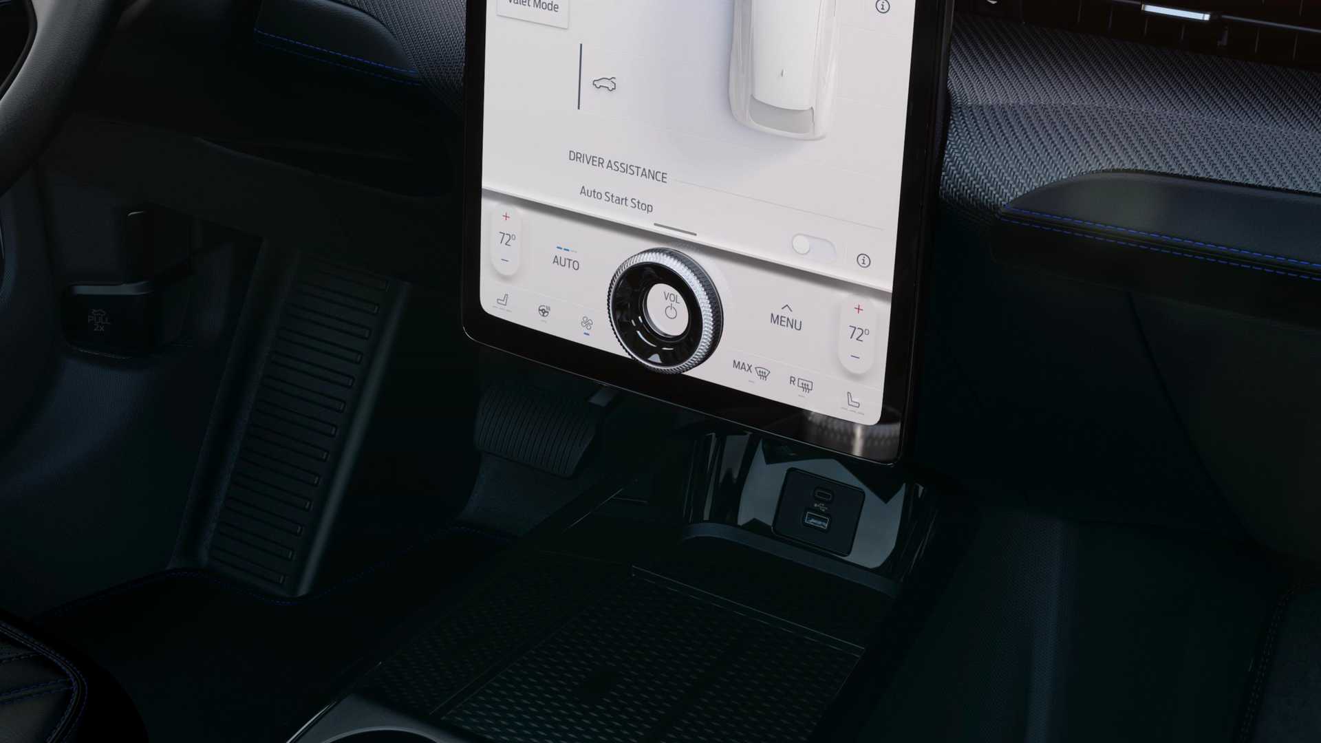 A l’intérieur, c’est la grande révolution. Ford a beau nous signaler que la planche de bord possède le double bossage caractéristique des Mustang, il faut vraiment être un commercial Ford ou un fanboy pour retrouver de la « Mustang » dans cette auto. En fait, on retrouve surtout du Tesla, notamment avec cet énorme écran tactile de 15 pouces en format portrait, qui servira à faire tout et rien : multimédia, navigation mais aussi climatisation.
