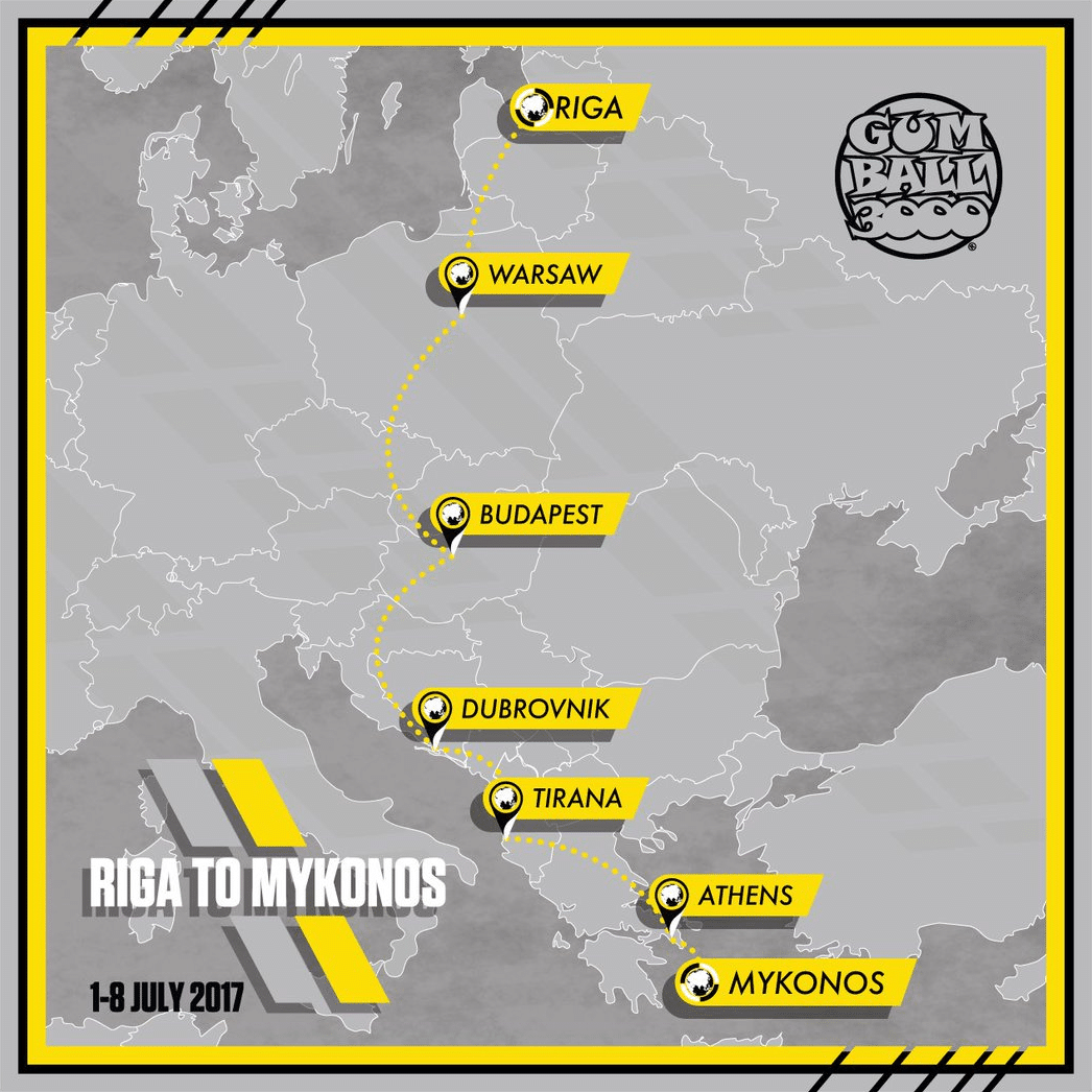 Pour le Gumball 3000 de cette année, le parcours sera 100% européen avec un départ à Riga (Lettonie), cinq étapes intermédiaires et une arrivée à Mykonos (Grèce). Le rallye durera 8 jours. Au programme, 3 159 km, 135 teams, des fous au volant, des soirées, des DJ, des célébrités, des entrepreneurs, des pilotes mais surtout des soirées incroyables.