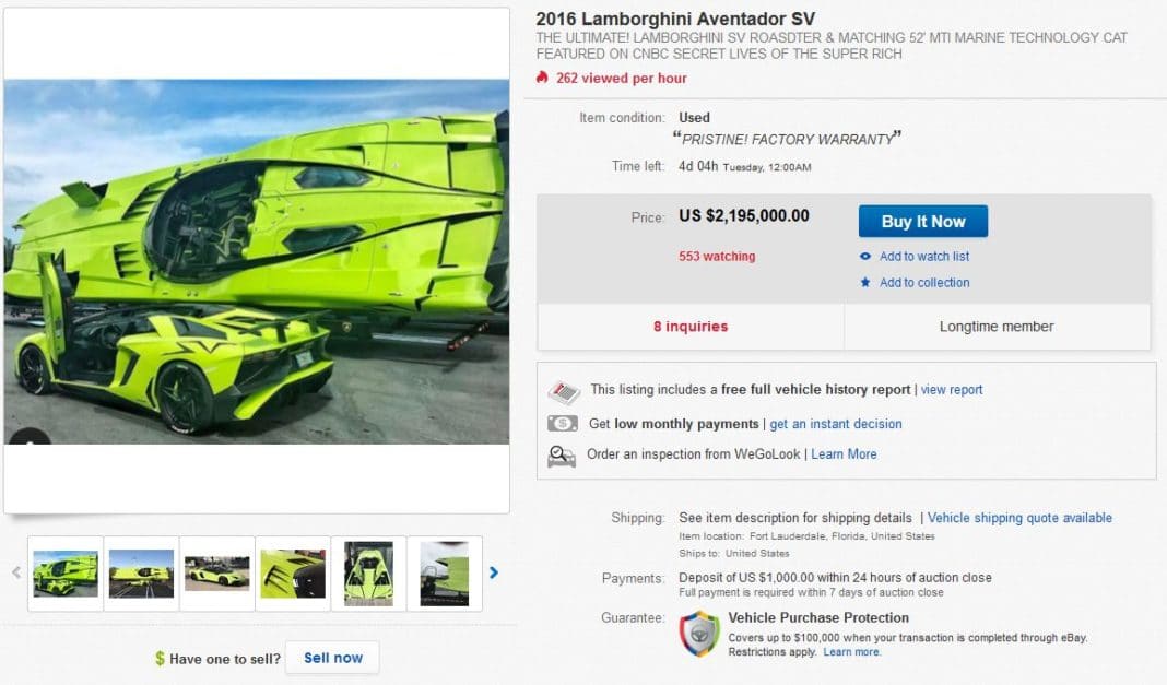 Pour conclure, sachez que si vous voulez franchir le pas et profiter de cette affaire, l’annonce est disponible en ce moment sur Ebay (image dans la galerie ci-dessus). Allez… une petite Lamborghini Aventador SV et un MTI 52’ Super Veloce c’est quoi franchement ? Seulement 159 années de SMIC (données juin 2017), une banalité !