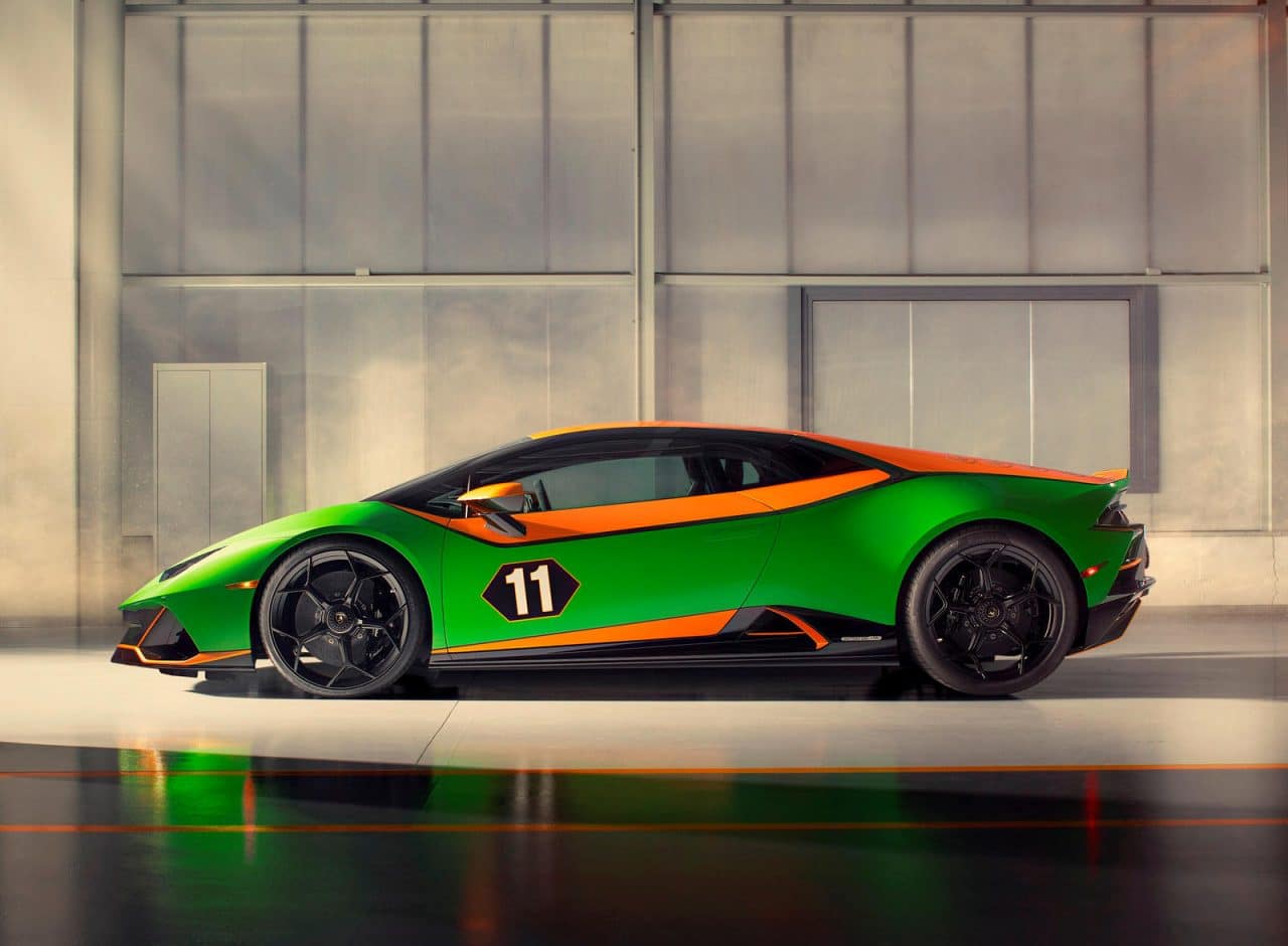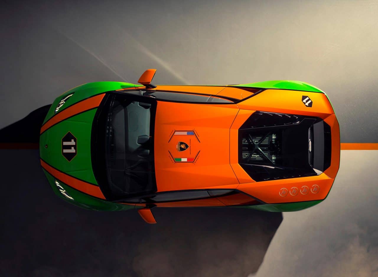Ensuite, vient la Lamborghini Huracan Evo GT Celebration. C’est un clin d’œil à la Huracan GT3 Evo, vainqueur des 24 heures de Daytona et des 12 heures de Sebring ces deux dernières saisons. La livrée reprend les couleurs du team GRT Grasser Racing, avec un combo orange Arancio Aten et vert Verde Egeria. La firme italienne a également créé trois autres combinaisons graphiques pour ceux qui trouveraient le vert et l’orange trop tape à l’œil.