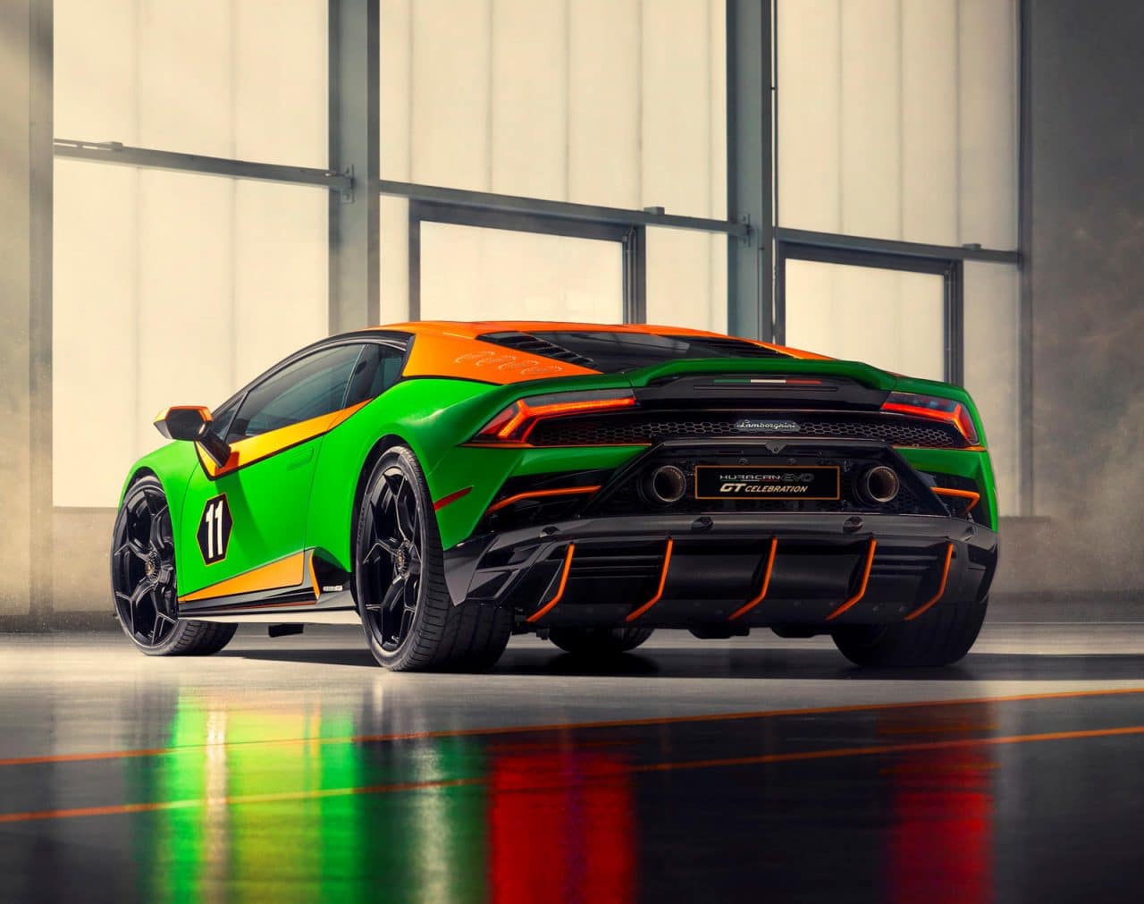 Ensuite, vient la Lamborghini Huracan Evo GT Celebration. C’est un clin d’œil à la Huracan GT3 Evo, vainqueur des 24 heures de Daytona et des 12 heures de Sebring ces deux dernières saisons. La livrée reprend les couleurs du team GRT Grasser Racing, avec un combo orange Arancio Aten et vert Verde Egeria. La firme italienne a également créé trois autres combinaisons graphiques pour ceux qui trouveraient le vert et l’orange trop tape à l’œil.