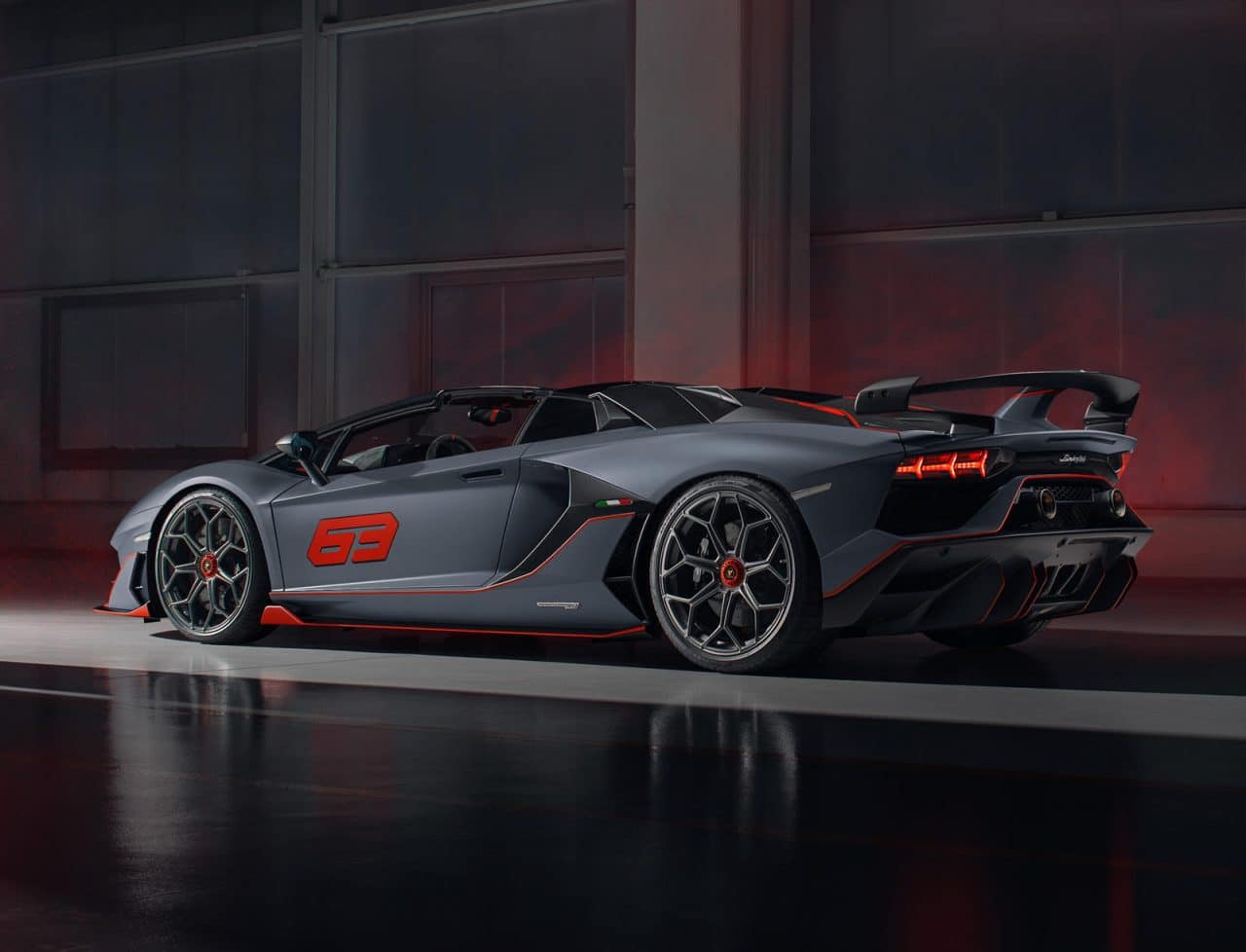 L’Aventador SVJ 63 Roadster rend hommage à l’année à laquelle la firme italienne a été fondée, 1963. La déclinaison spéciale de cette supercar, dotée de 12 cylindres, s’accompagne de 8 choix différents de personnalisation extérieur et intérieur. Justement, à l’extérieur, difficile de passer à côté de sa nouvelle livrée, ses nouvelles jantes en titane et de toute la fibre de carbone présente sur le toit, le capot moteur, les prises d’air ou encore sur les rétroviseurs.