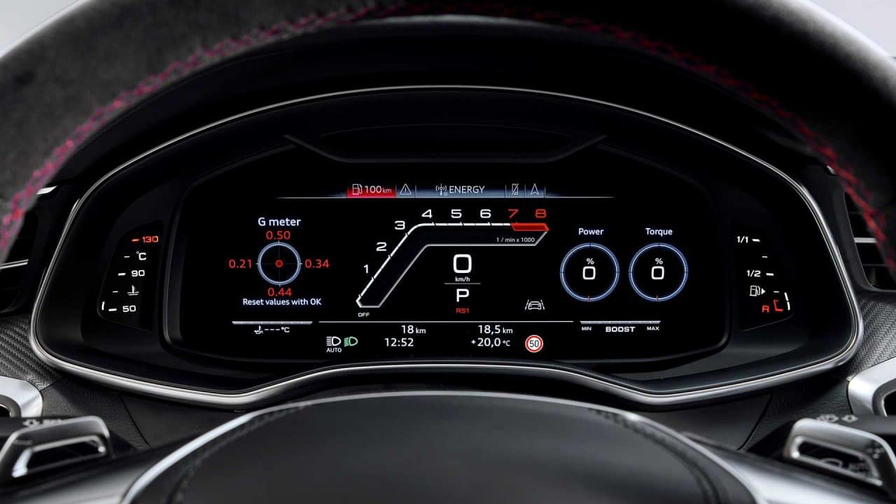 Nous retrouvons donc le V8 4.0 biturbo à microhybridation (réseau électrique 48V) développant 600 ch et 800 Nm, dès 2000 tr/mn. Vous pourrez dépasser les 300 km/h en RS7, mais pour cela, il faudra piocher dans les options et opter pour la suppression de la bride électronique, qui limite la vitesse à 250 km/h.