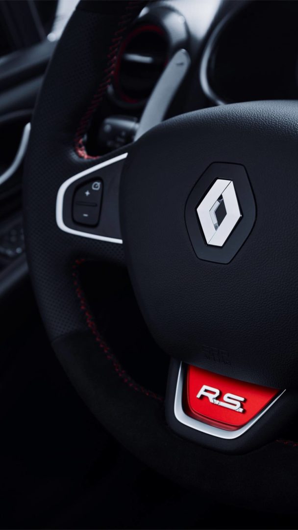 Globalement, la plupart des autres éléments de la voitures sont assombries, comme le démontre le losange Renault, le sigle R.S. ou encore le bouclier avant. N’oublions pas le diffuseur arrière qui cercle deux sorties d’échappement signées Akrapovic.