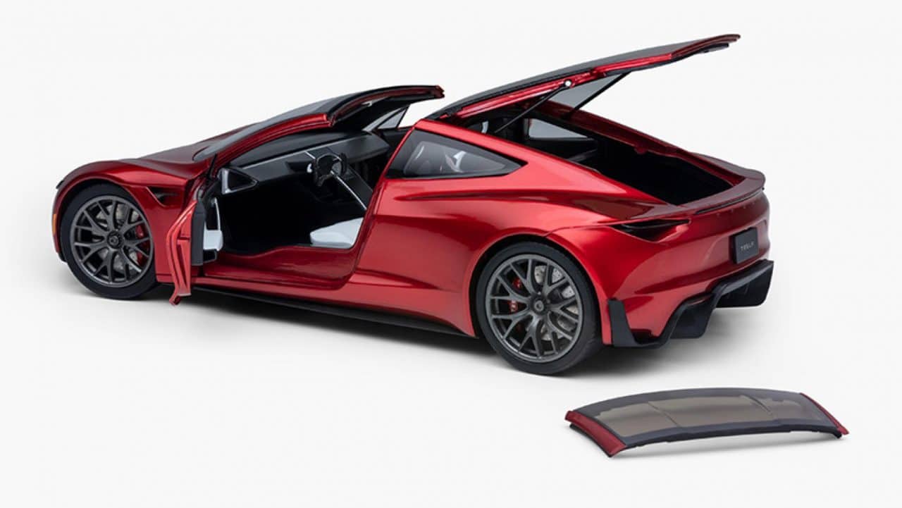 L’impression de cette miniature s’appuierait même sur le design utilisé dans le logiciel de dessin assisté par ordinateur (DAO) de Tesla. Le modèle réduit est composé de 180 pièces différentes (en métal et plastique). Les portes peuvent être ouvertes avec une vision détaillée de l’intérieur. Même le hardtop est retirable et les ceintures sont fait de la même matière que les vraies. Est-ce que cela signifie que le futur Tesla Roadster aura le même volant futuriste ? On l’espère. En attendant, les collectionneurs et les FanBoy de la marque pourront se l’offrir en échange de 250$.