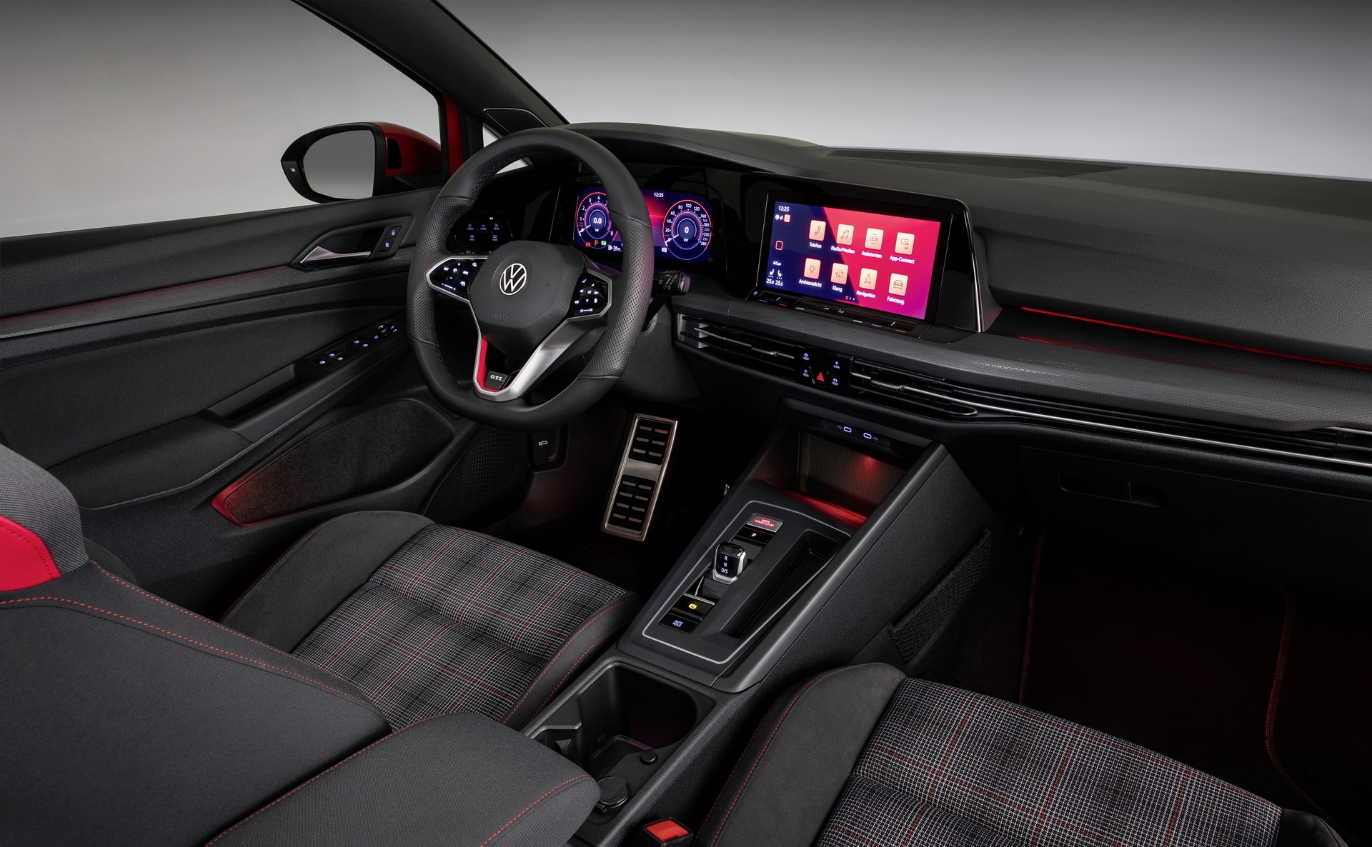 Dans l’habitacle, et de série, si vous faites abstraction du badge GTI dans le bas du volant, les motifs rouges sur les sièges et aux traits d’ambiance lumineux de la même couleur, difficile de deviner que vous êtes à bord de la version la plus sportive du catalogue. Bien que l’on apprécie le clin d’œil au passé et aux anciennes GTI avec un tissu écossais, cela n’aide pas le cas des Golf 8 GTI et GTD.